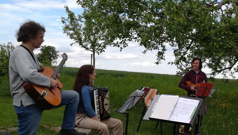 Im Frühjahr 2020 kam Isa, unsere zweite Geigerin dazu, und wir nutzten das schöne Wetter und die coronabedingte freie Zeit zum Proben unter Apfelbäumen und um von vollen Tanzflächen zu träumen.
